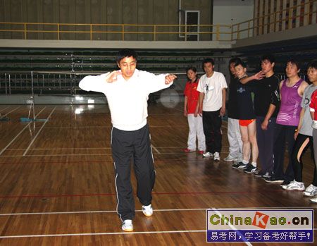 由于天气原因,本应在运动场进行的田径方向体育加试转移到羽毛球馆进行。为了让考生正常发挥水平,缓解紧张气氛,田径招生组组长李建臣在推铅球技术测试前亲自上阵,为考生分步骤做动作示范,留给考生思考和回忆技术要领的时间。